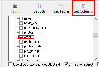- You will get the columns that are in the table "Orders". Now tick on something that related to credit cards information, such as cc_number , cc_type , cc_expired_year ,cc_expired_month , and cvv or cvv2. Once you're done, click on Get Data